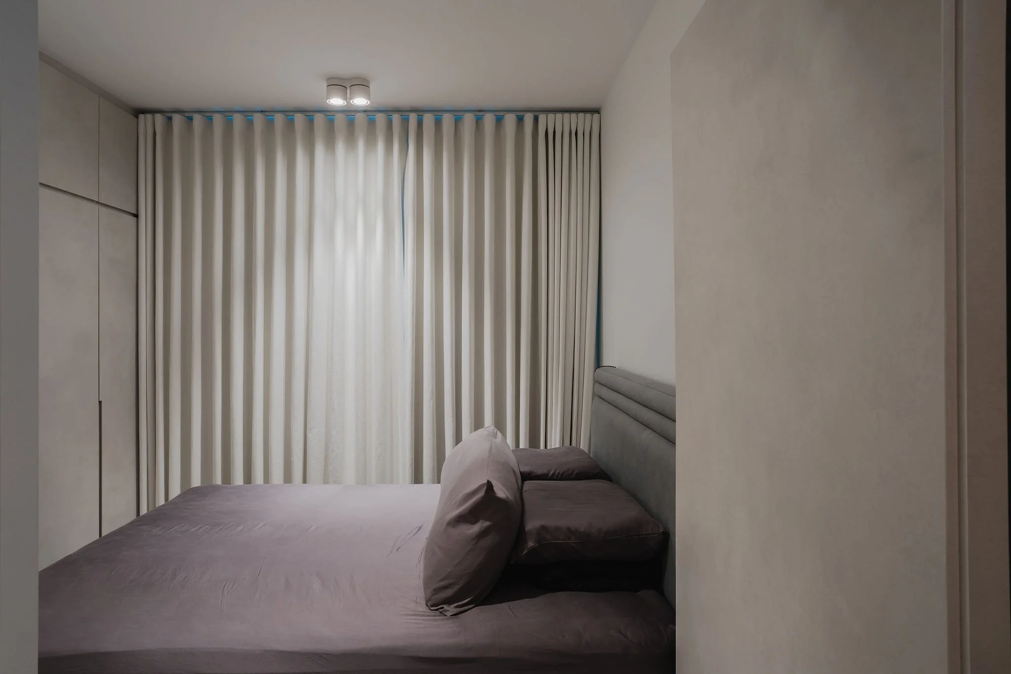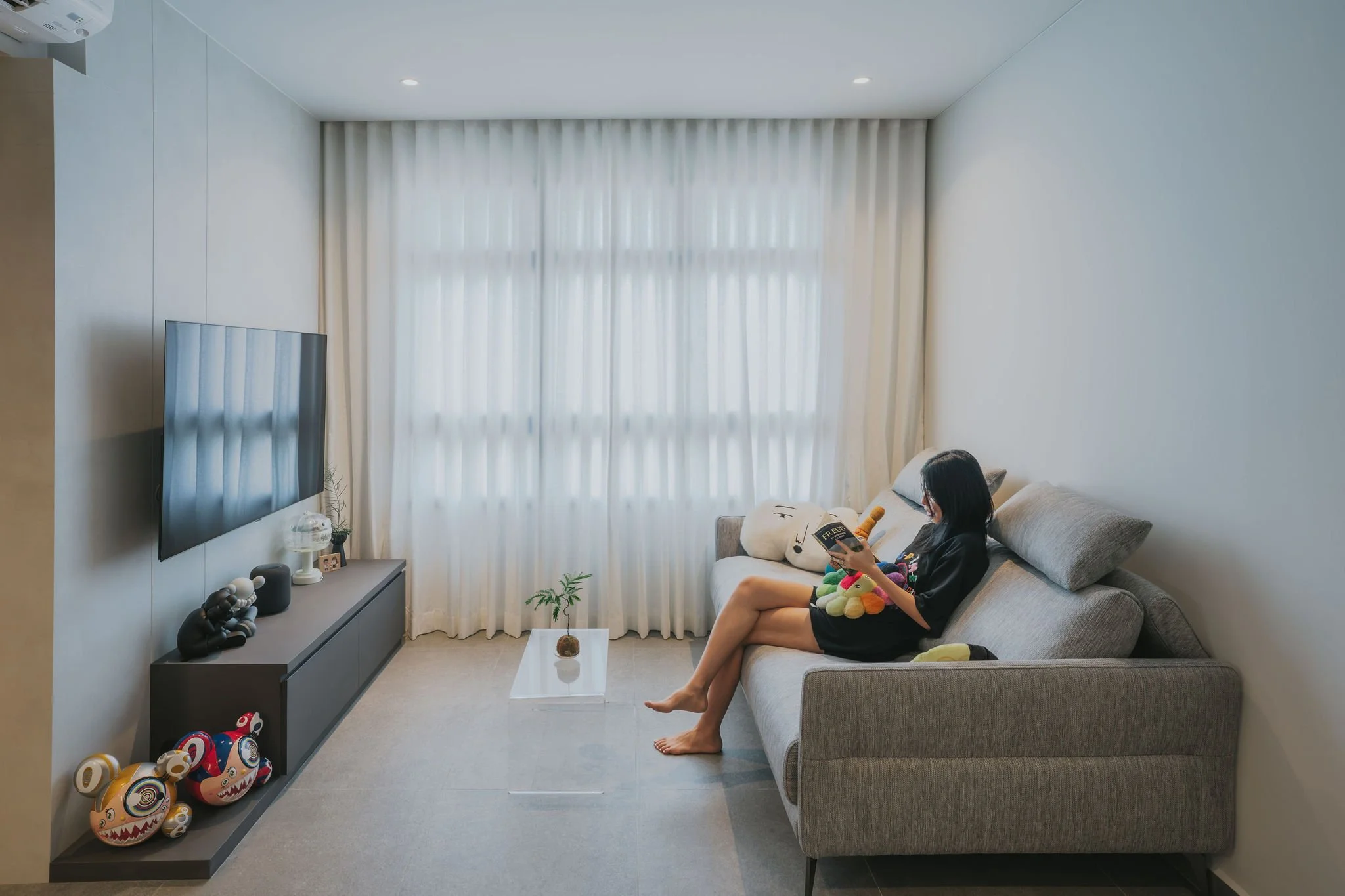 Mimicking the ambiance of an exclusive art space, the bedroom and bathroom doors are concealed by the feature wall. Shoe cabinets are skillfully used to conceal the bomb shelter’s door to give a seamless look. Completing the living room with concrete-looking floor tiles to create an art gallery ambiance.