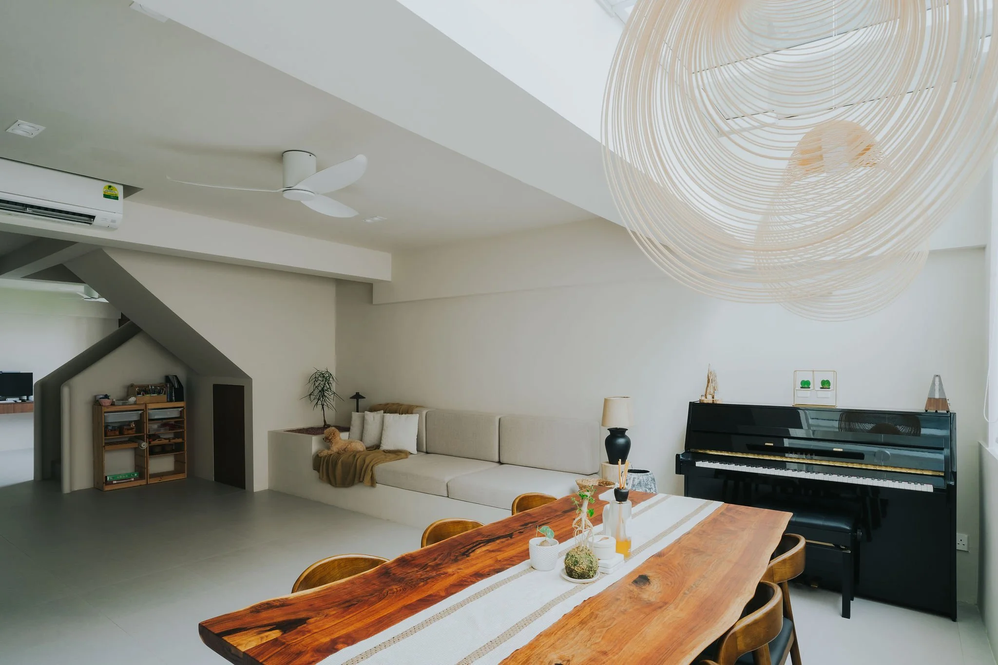 A Jurong West HDB maisonette blending three styles with open, airy spaces and villa-inspired touches for relaxed family living.
