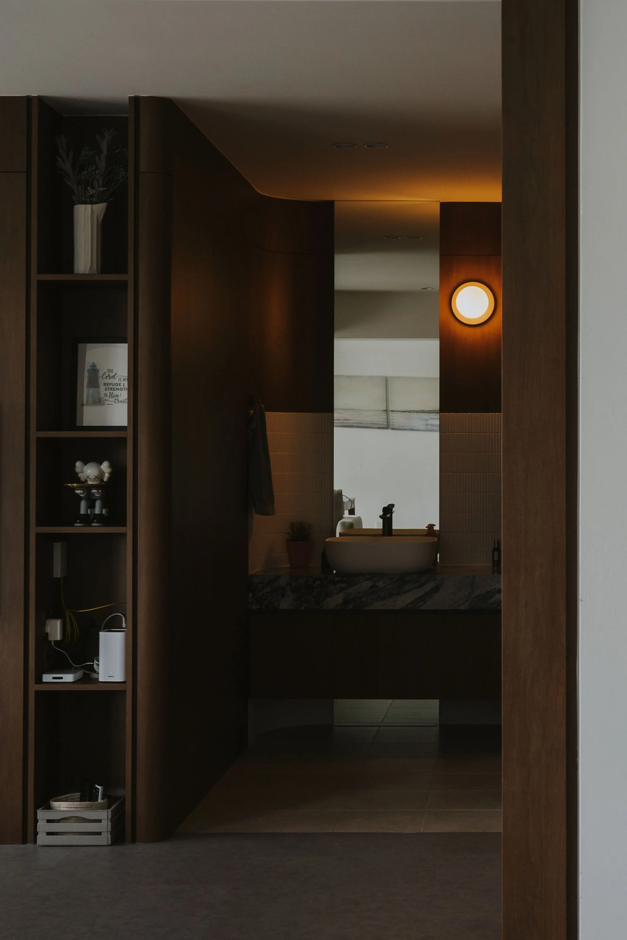 Throughout the design process, we carefully considered the homeowner's requirements and needs. One of the considerations was the placement of the basin in the common bathroom. The basin was strategically positioned, separated from the common toilet. This not only enlarged the common bathroom but also eliminated the need for cabinets in moisture-prone areas, becoming a key feature of the house.
