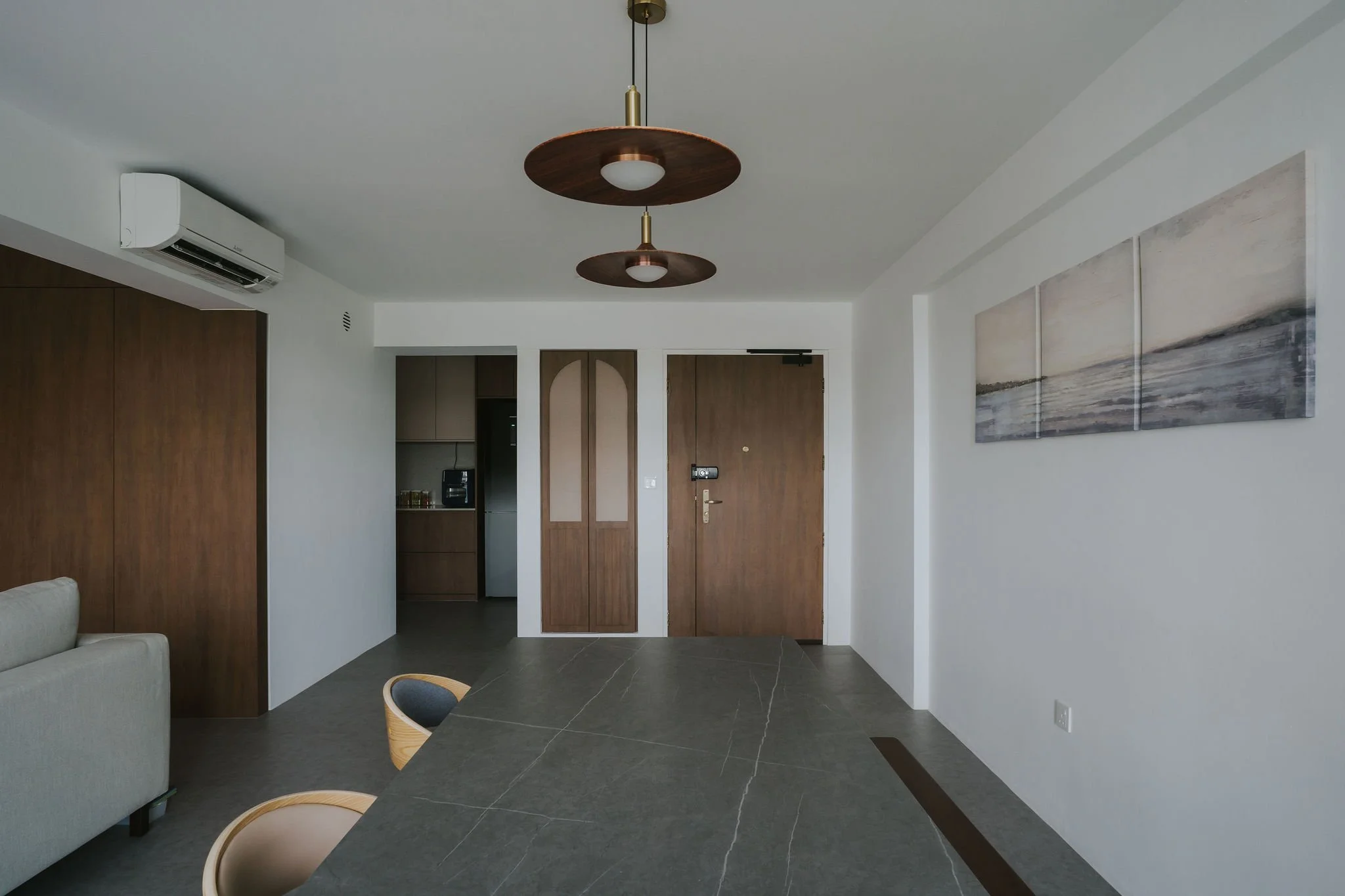 To enhance the overall aesthetic and create a cozy atmosphere, laminate feature walls were installed in the living area. The key to beautifying the house was a conscious decision to limit the lamination choices to two colors. This approach minimizes color variations and contributes to a cohesive and visually appealing space. Despite the challenges, the homeowner is delighted with the final result, and our designer is equally pleased with the flawless execution of the project.
