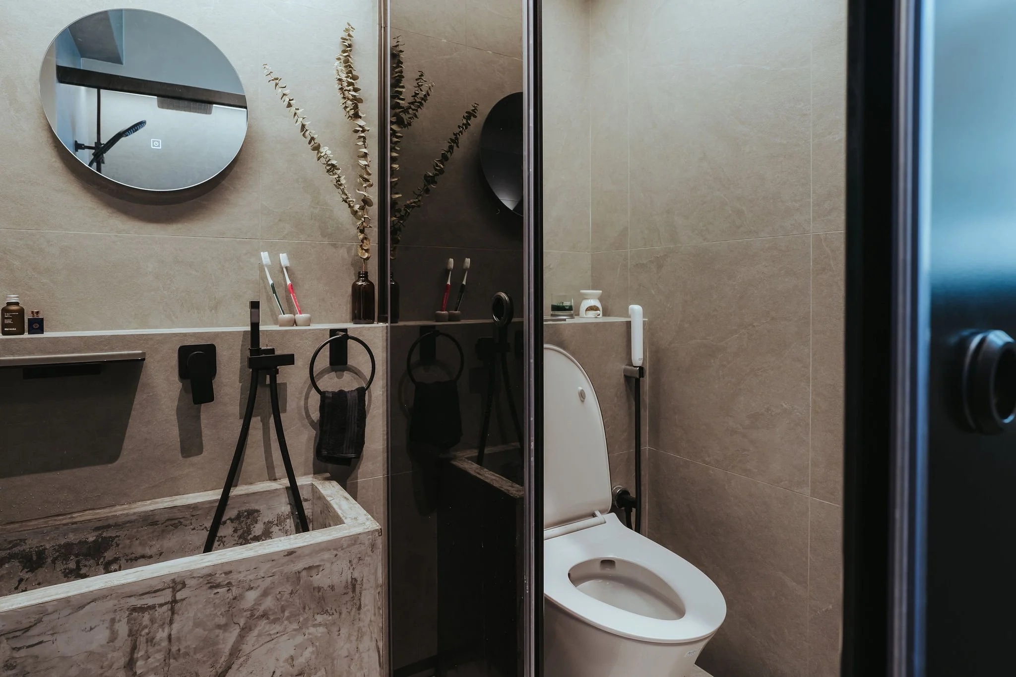 Consistency in theme is evident in the bathroom as well. A DIY concrete sink complements the concrete grey tiles, creating a harmonious aesthetic. Tinted black-out shower screens are utilized to ensure privacy in the shower and WC areas.