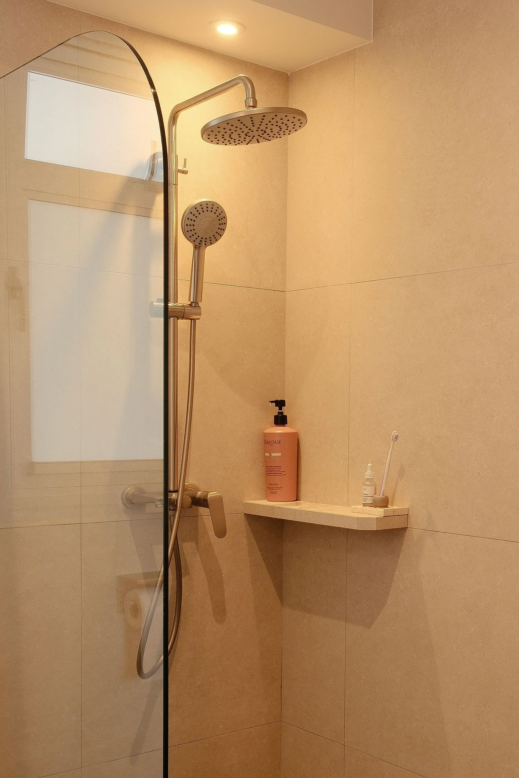 This is a 4 room BTO and one of the common bedroom was hacked off so that the living and dining area will have more space for hosting. The soft finishing used are mostly neutral colours in tones of grey and beige. This complements the main feature of the house which are the wood elements and this really helps to soften the house to create a cozy feeling. Larger square tiles was used in the living and dining area to make the house look visually bigger.