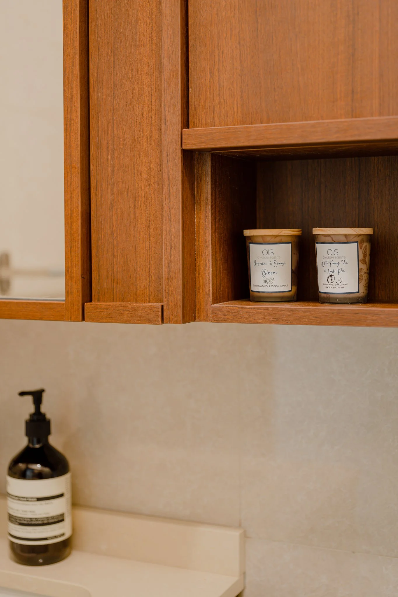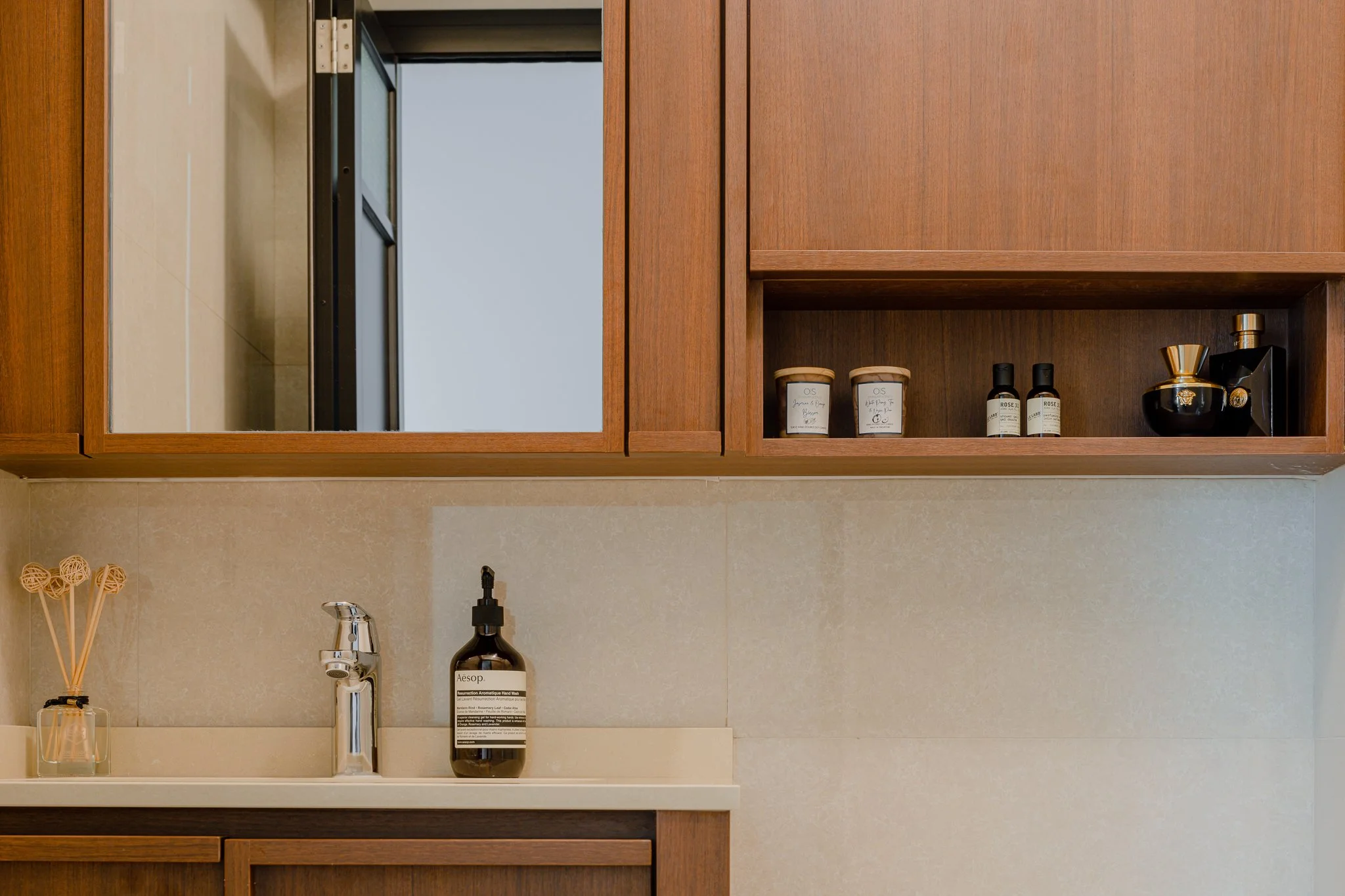 The continuity use of materials and guiding principle in the bathrooms harmonizes with the rest of the place by adding warmth to an otherwise simple space. Incorporating unsuspecting tactile touches like the indentation on the mirror vanity, it performs beyond just a visual interest, its created to generate airflow fluidity whilst concealing the given windows, minimizing clutter and uninterrupted consistency.