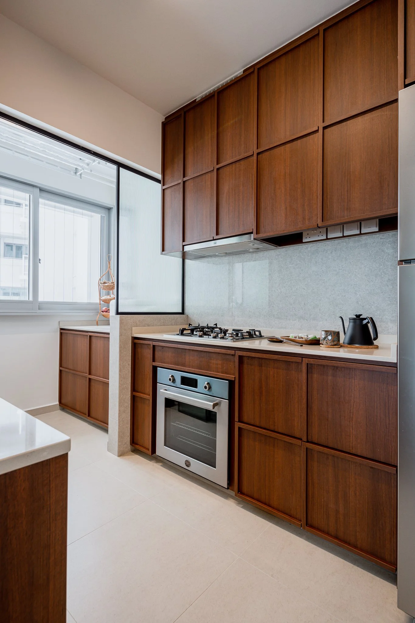The kitchen wall was demolished midway to open-up the space, creating an illusion of openness, allowing more visual connectivity through the entire hosting space whilst borrowing natural light to bounce off each area through the home. A double gallery cabinetry was introduced with subtle design elements that complements the core of clean lines and functionality in order to utilize the tight square footage of a kitchen with enough storage opportunities to grow alongside the family. Ridded glass doors and panels were also selected to efficiently allow light to bounce through and acts as a barrier of opacity to conceal the laundry area while cooking and/or hosting.