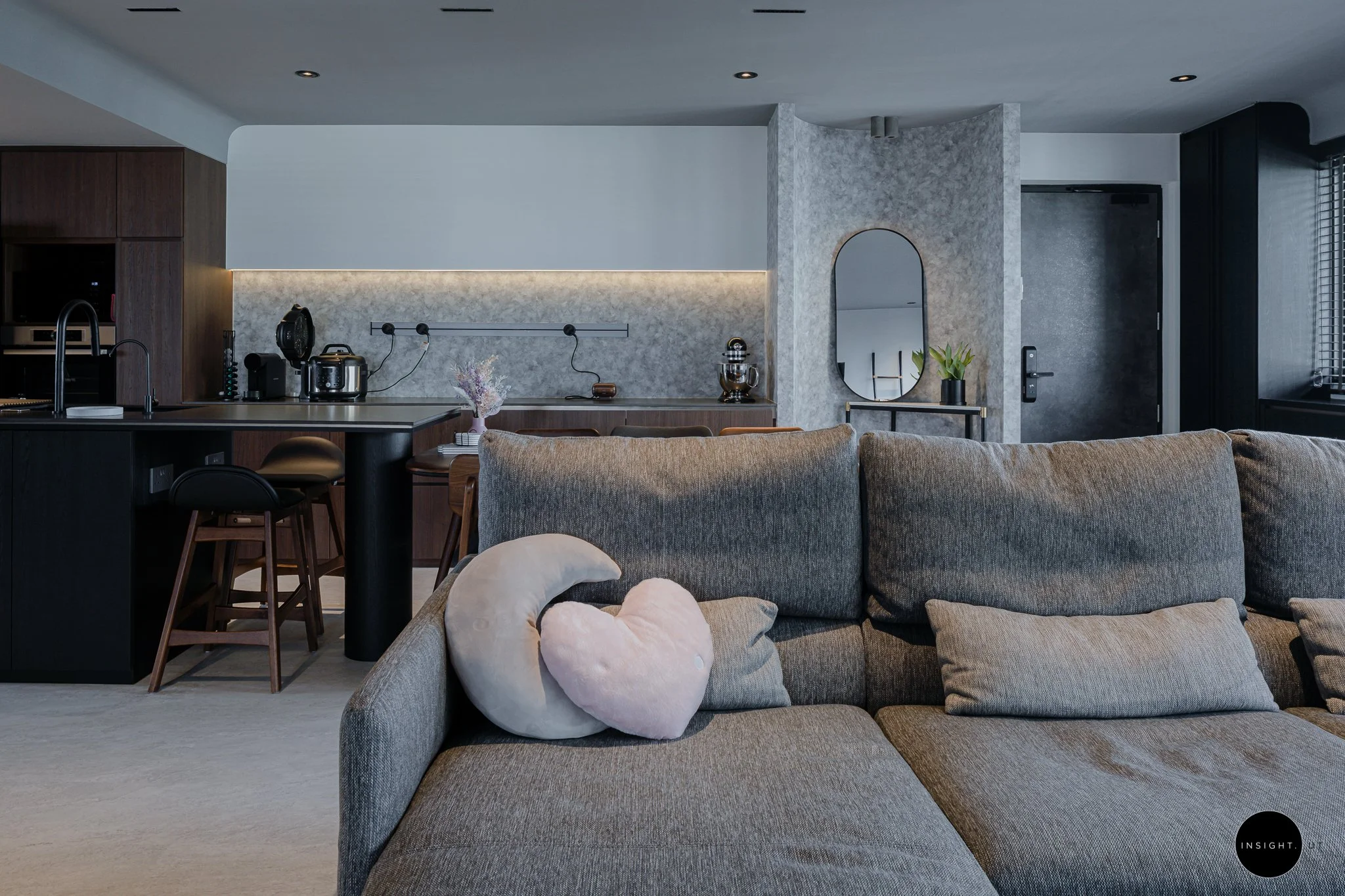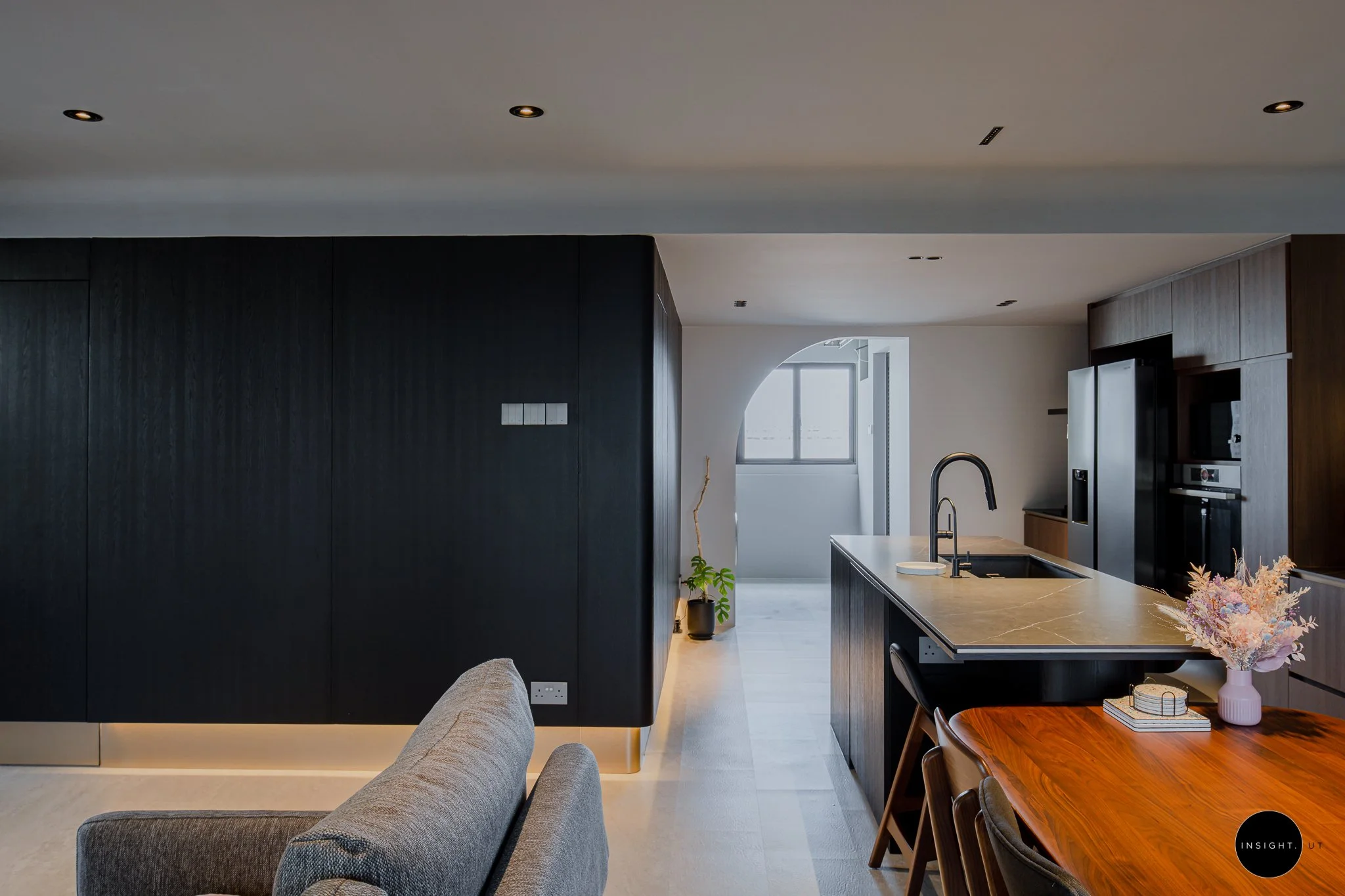 It is a huge 5 room flat with an open concept kitchen with two rooms combined into one master bedroom for extra space for a dresser and wardrobe. The unique feature of the house is to have a long seamless feature wall with recess gold detailing w led light ambient. This featured wall can be your passageway to storeroom, dresser, and master bedroom. It’s designed to be sleek and clean, while creating an area that allows the rest of the home to flow seamlessly with the open concept kitchen.