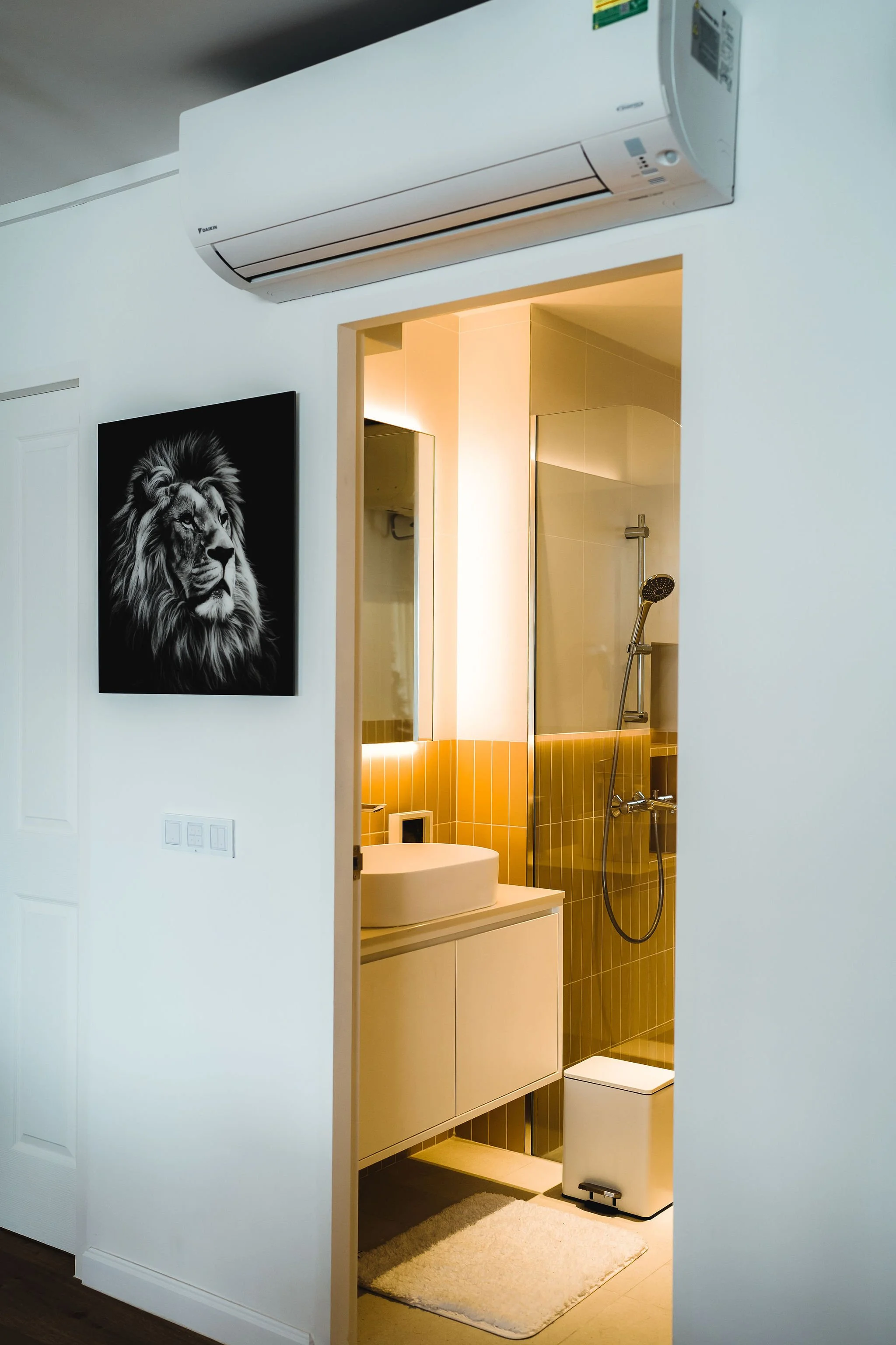 The owners desired larger bathrooms, so both toilets were extended. The master toilet posed a challenge due to limited space, which prompted the construction of a curved wall to optimize the walking space towards the master bedroom. To make the most of the curved space, a dressing table was built, creating a cozy atmosphere.