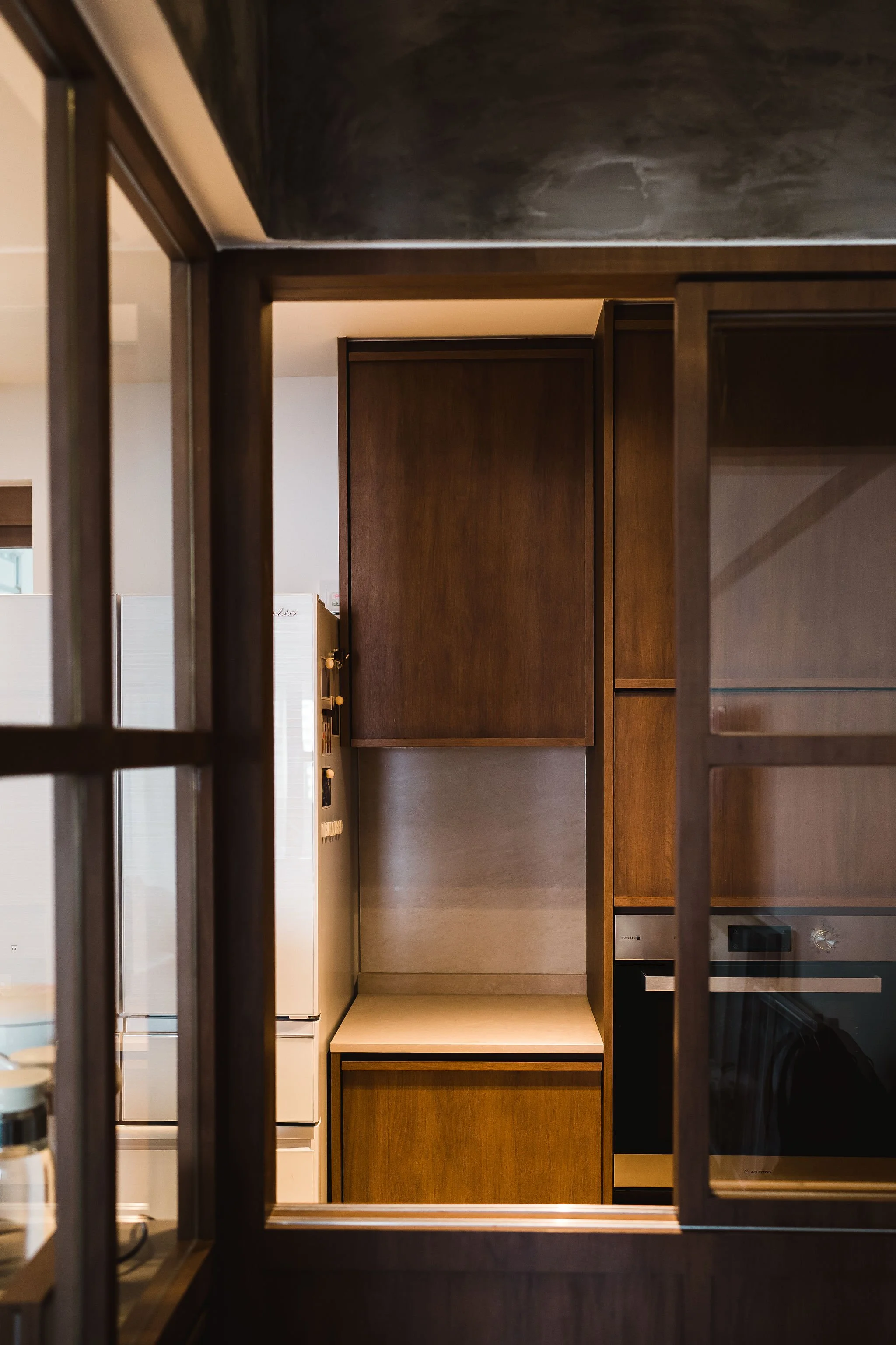 The owners desired a larger kitchen space with a semi-open concept, as they frequently engage in cooking activities. To create a sense of spaciousness, glass was utilized, enlarging the kitchen area. We also created a separate service yard in response to their needs. The owners' fondness for the raw and textured appearance led to the selection of a Caesarstone countertop and tiled kitchen backsplash, both of which emphasize the desired aesthetic. Additionally, a stainless steel countertop was chosen for the cooking side to create a professional chef's kitchen feel.