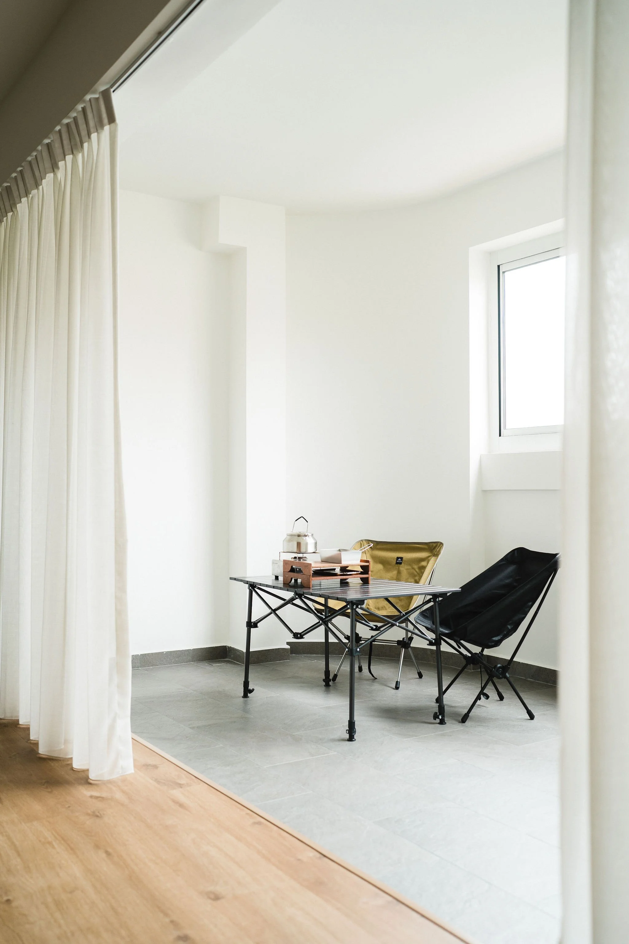 Considering the owners' love for outdoor adventures, the balcony was transformed to offer a panoramic view and facilitate outdoor cooking with its stone-like tiled surface.