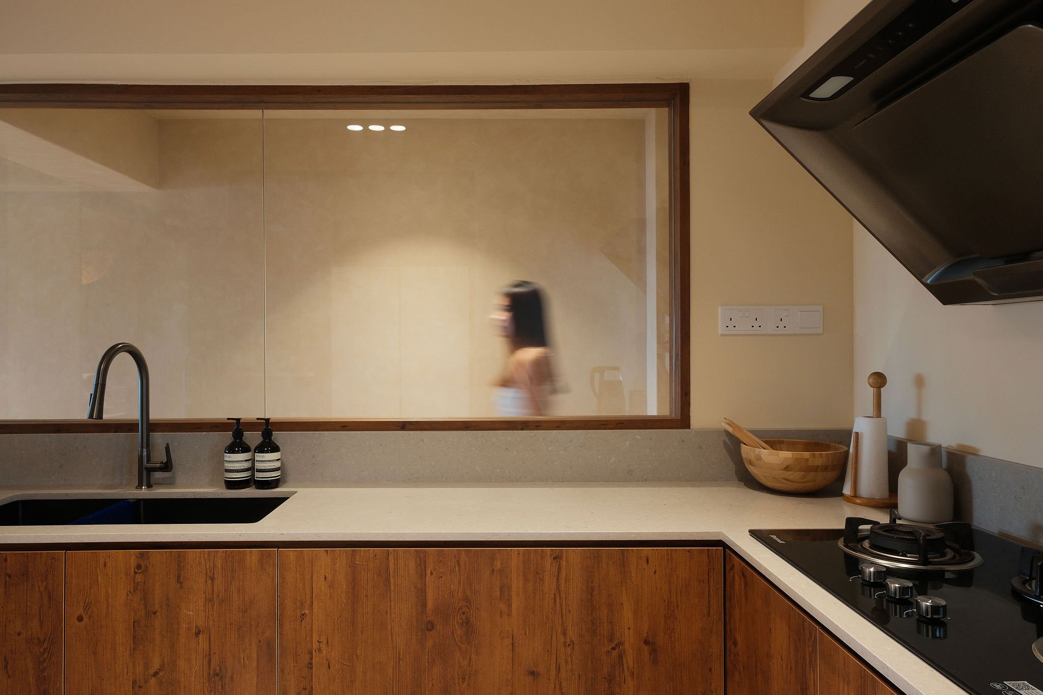 Seeing that the home could do with more daylight, Roy introduced a glass window to look into the enclosed kitchen. It faces the foyer leading into the living area. The cookspace is set in an L-shaped configuration and features Caesarstone countertops. Eliminating the usual tiled backsplash, Roy opted for a 150mm-tall skirting which is now installed along the countertop. This lends a more seamless aesthetic, which enhances the uncluttered visage of the limewash painted backdrop.