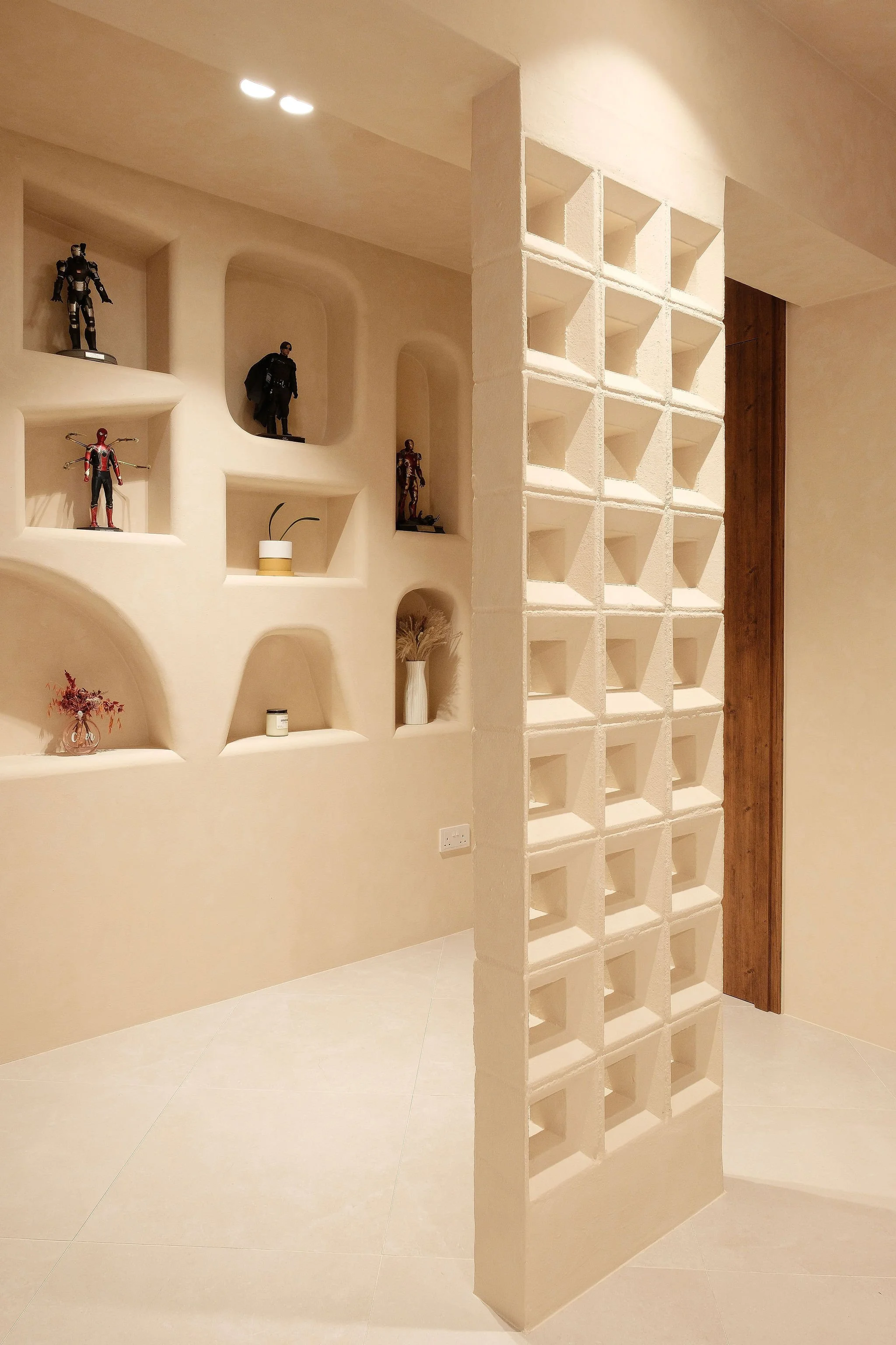 To deliver the brief, he and the homeowners decided on a complete revamp, where nothing was kept from the previous setting. Roy and his team took 10 weeks to execute a refreshed configuration where one of the prominent changes made was to the walkway area near the dining zone. Rather than leave the walkway bare, they erected a full-height display shelf on the wall with grotto-shaped niches that soften the minimalist look. A breeze block divider was also built to subtly zone the walkway from the dining area, allowing light and ventilation to filter gently into the space.