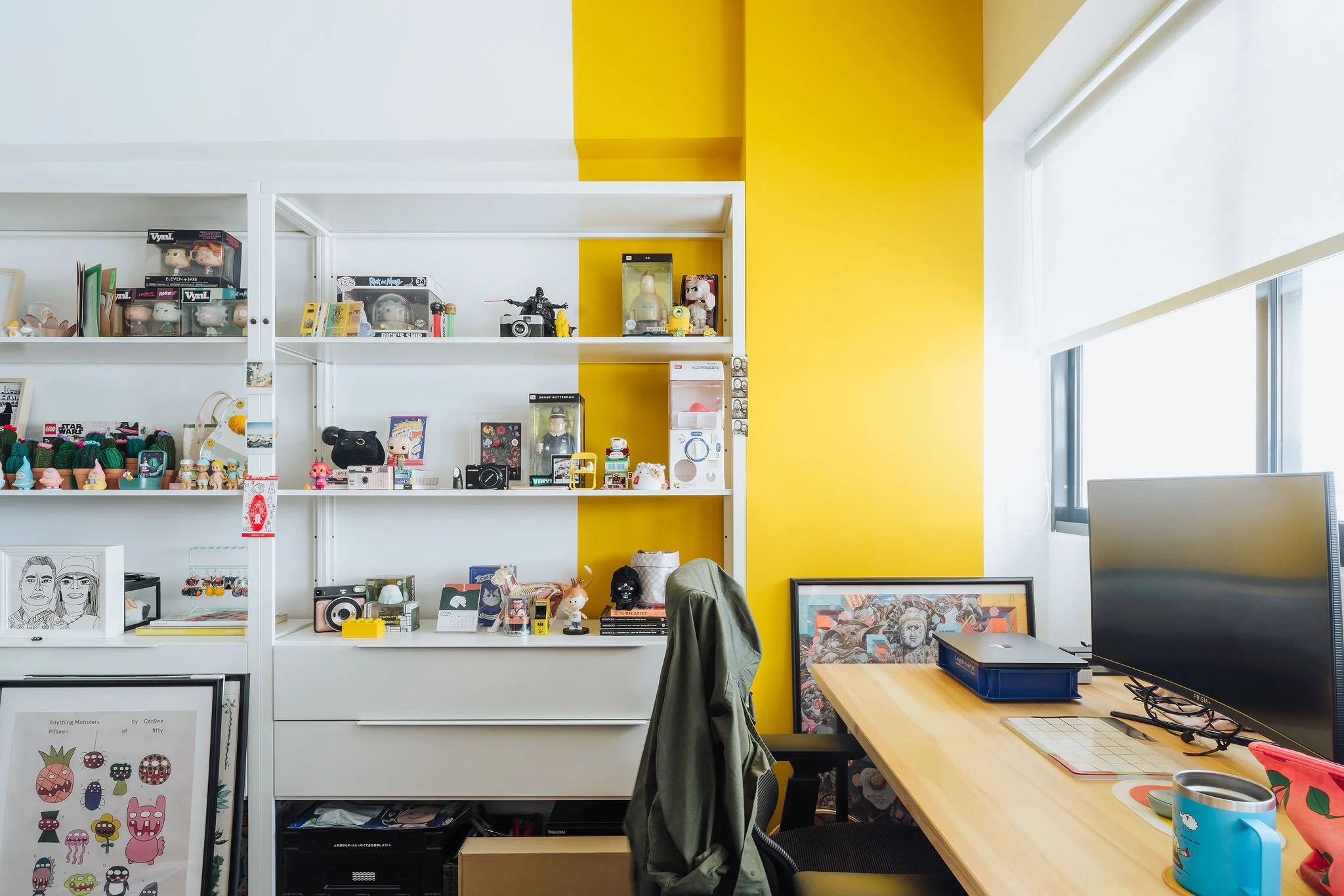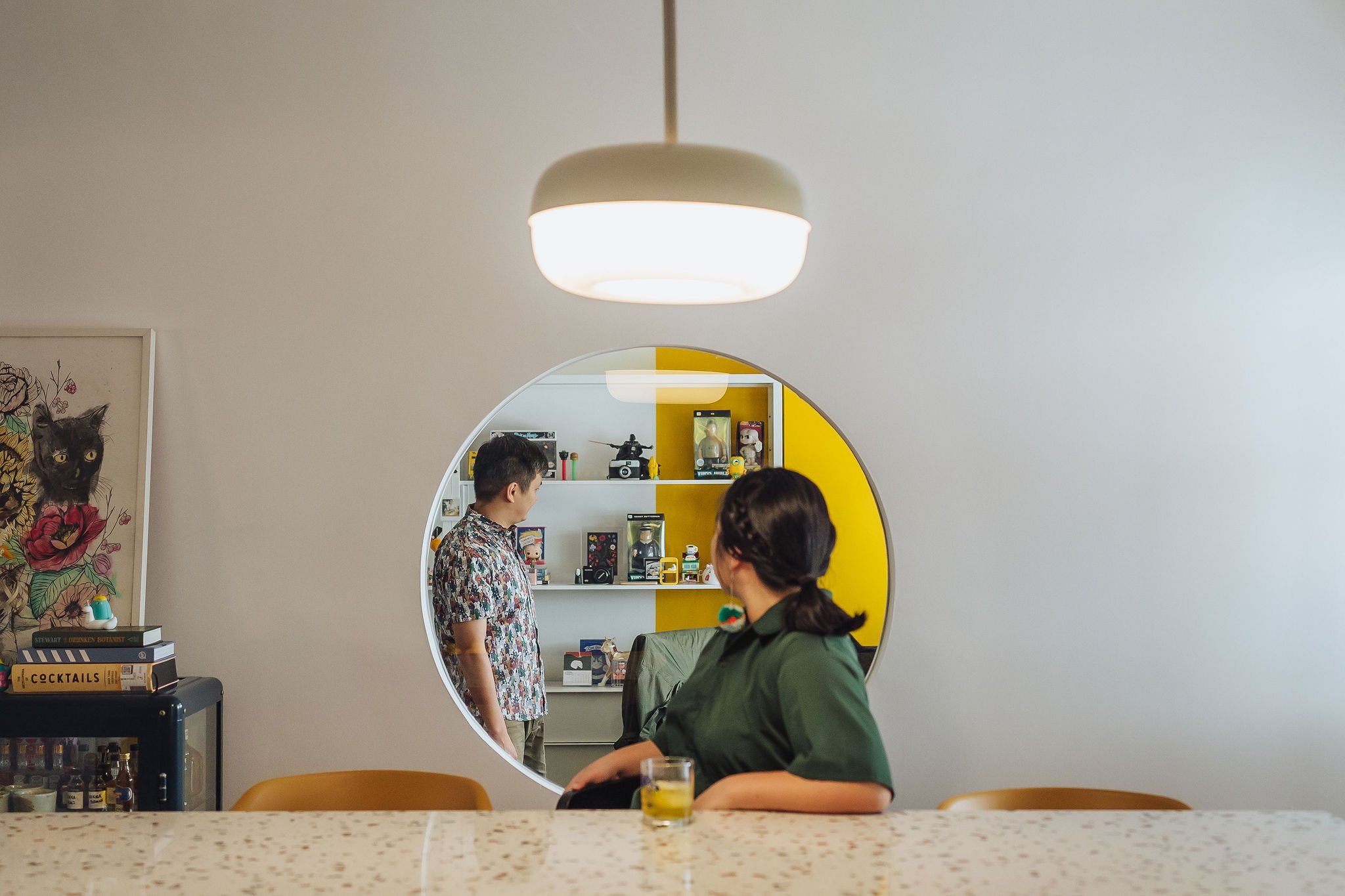 Nothing beats coming home to your fur babies! This project is close to the hearts of pet lovers, embracing maximalism to reflect the owners’ lifestyle while incorporating thoughtful features for their beloved cats. With a harmonious palette of green, yellow, white, and dark wood, the design creates cozy pockets of space fit for relaxation and connection. The layout is full of small but clever details; in the heart of the home, a high dining table paired with a statement light becomes a stylish focal point, framed by a circular cut-out wall that offers a playful peek into the adjoining study room. Practicality is seamlessly incorporated by doors fitted with a miniature cat-sized entrance, ensuring that the fur babies can move about freely without the need to constantly open doors.