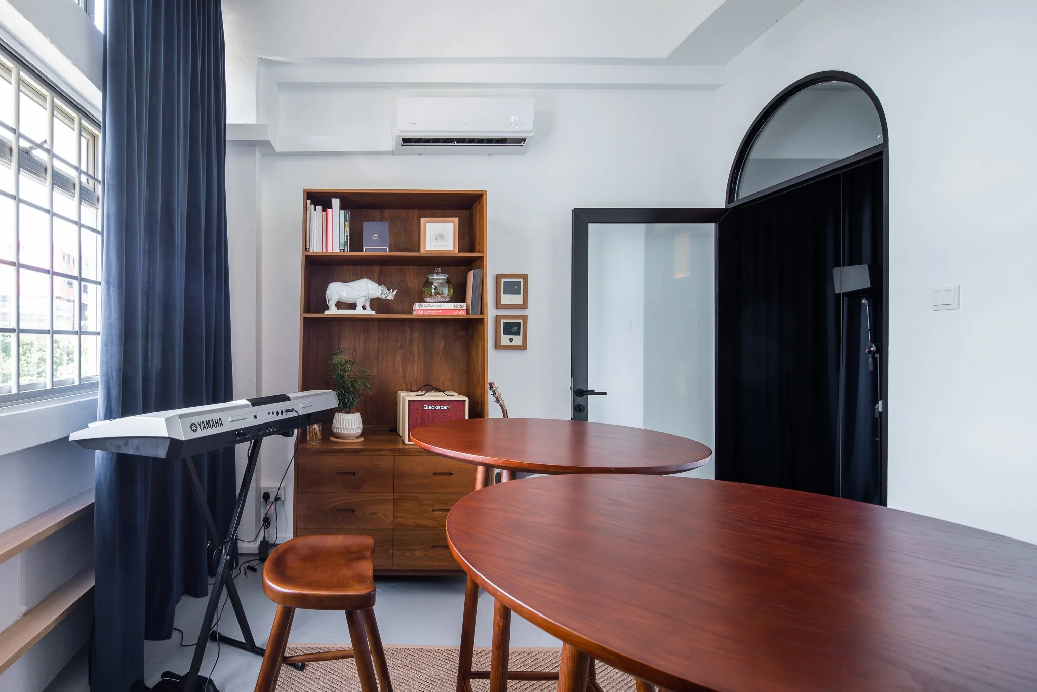 The material of this curtain is Navy Velvet, it is a rare find which took us 6 weeks to get it fabricated to match the high ceiling height. The thickness of the curtain reduces noise from the individual music rooms to prevent students from getting distracted. This curtain acts as a performance backdrop for when our client wants to hold mini performance for the audience. There is a hidden music room behind the curtain, segregated by the curtain. The double lami glass used reduces the sound of the music from inside.