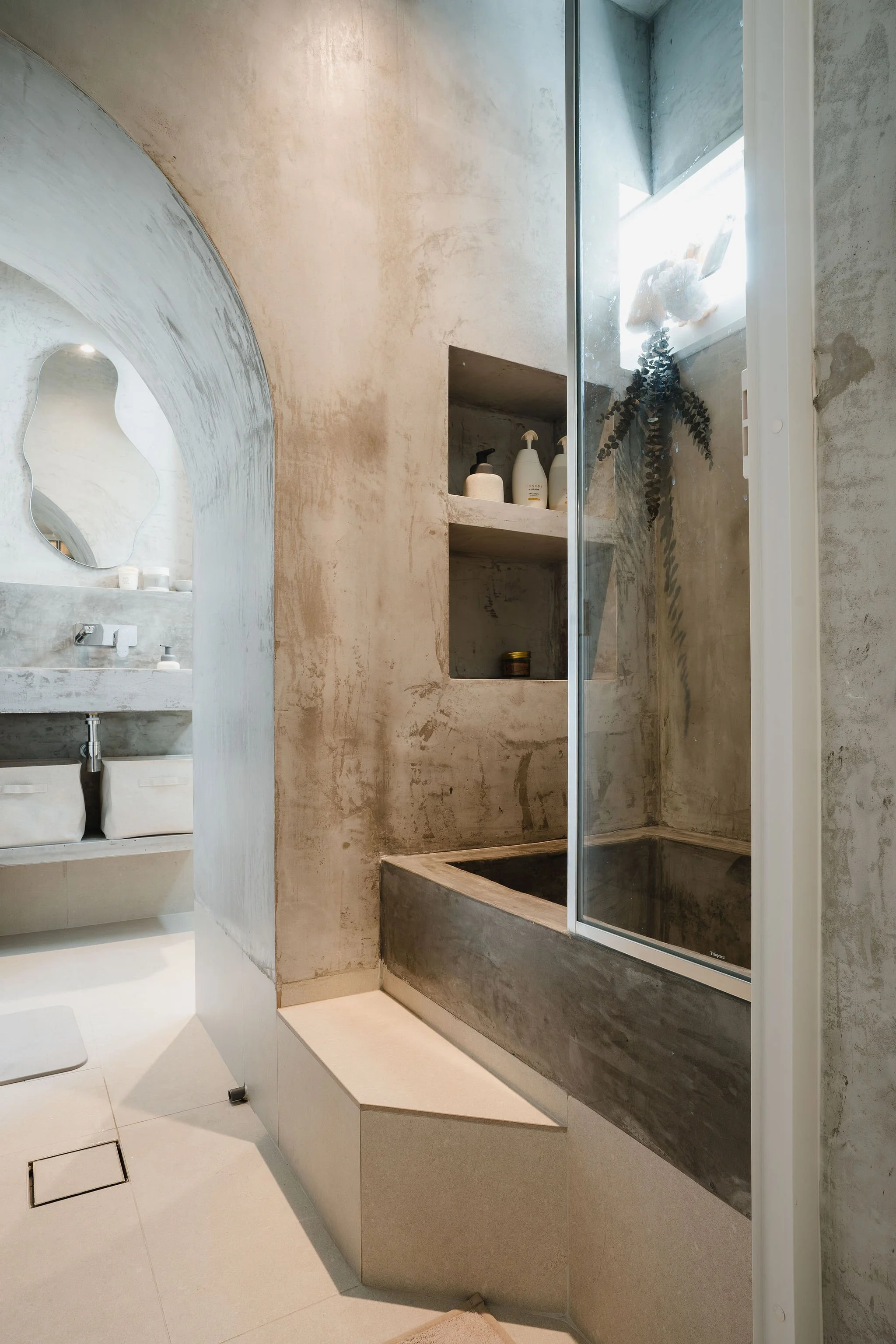 Captivated by the vision of this transformative project, the homeowner approached the expertise of Insight.Out Studio to curate the interior design of their unit. The homeowner loves drawing inspiration from Wabi Sabi style so elements reminiscent of Wabi Sabi were incorporated throughout the house. A striking feature is the timeless glass block and mosaic arch entrance, reminiscent of a bygone era, meticulously revitalized to harmonize with the overall design ethos.
