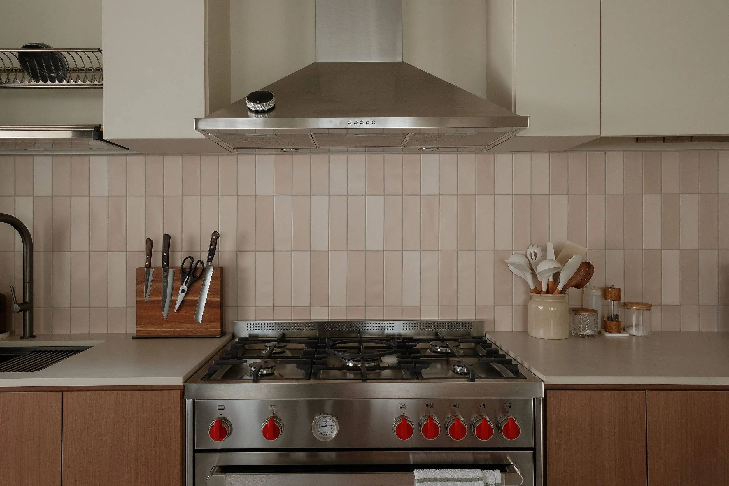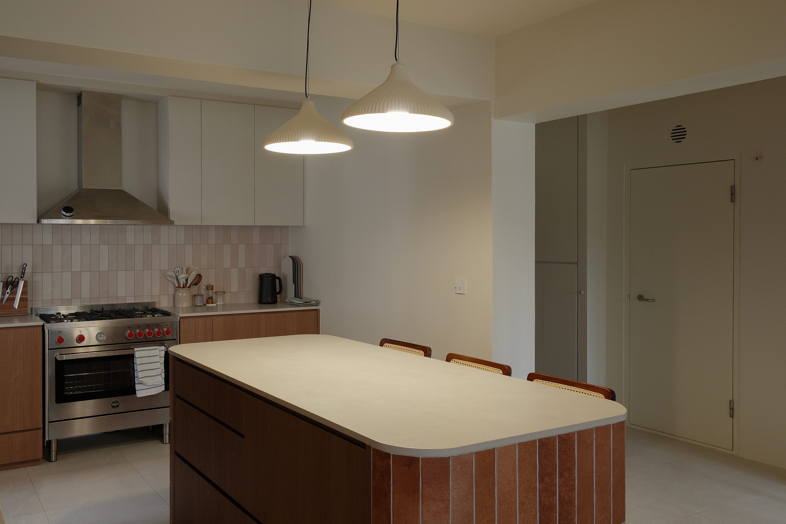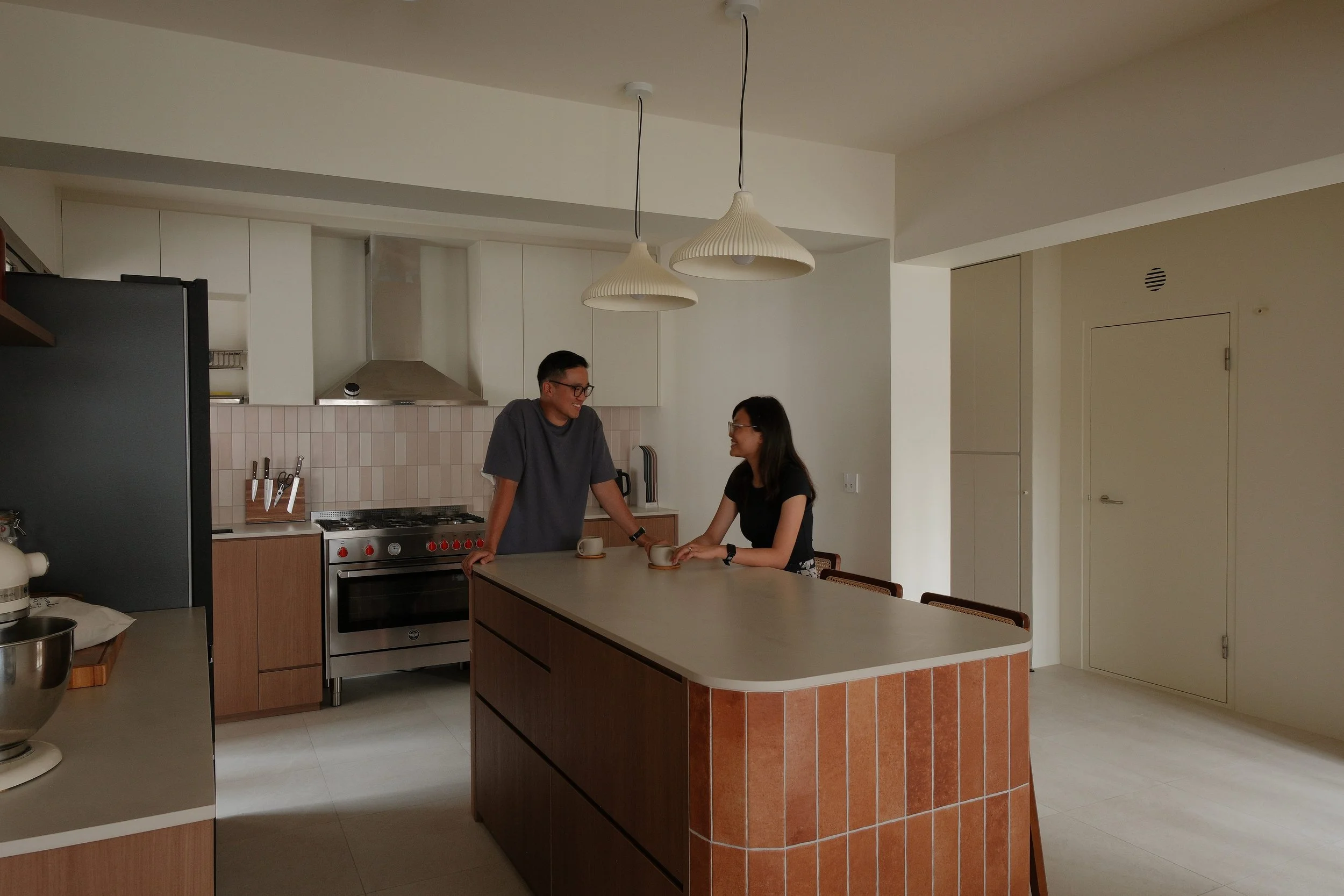 The kitchen is designed for their height, with a tall island, ample storage, a subway tile backsplash, and a lit display shelf that doubles as a power hub; perfect for cooking, coffee, or lingering together.