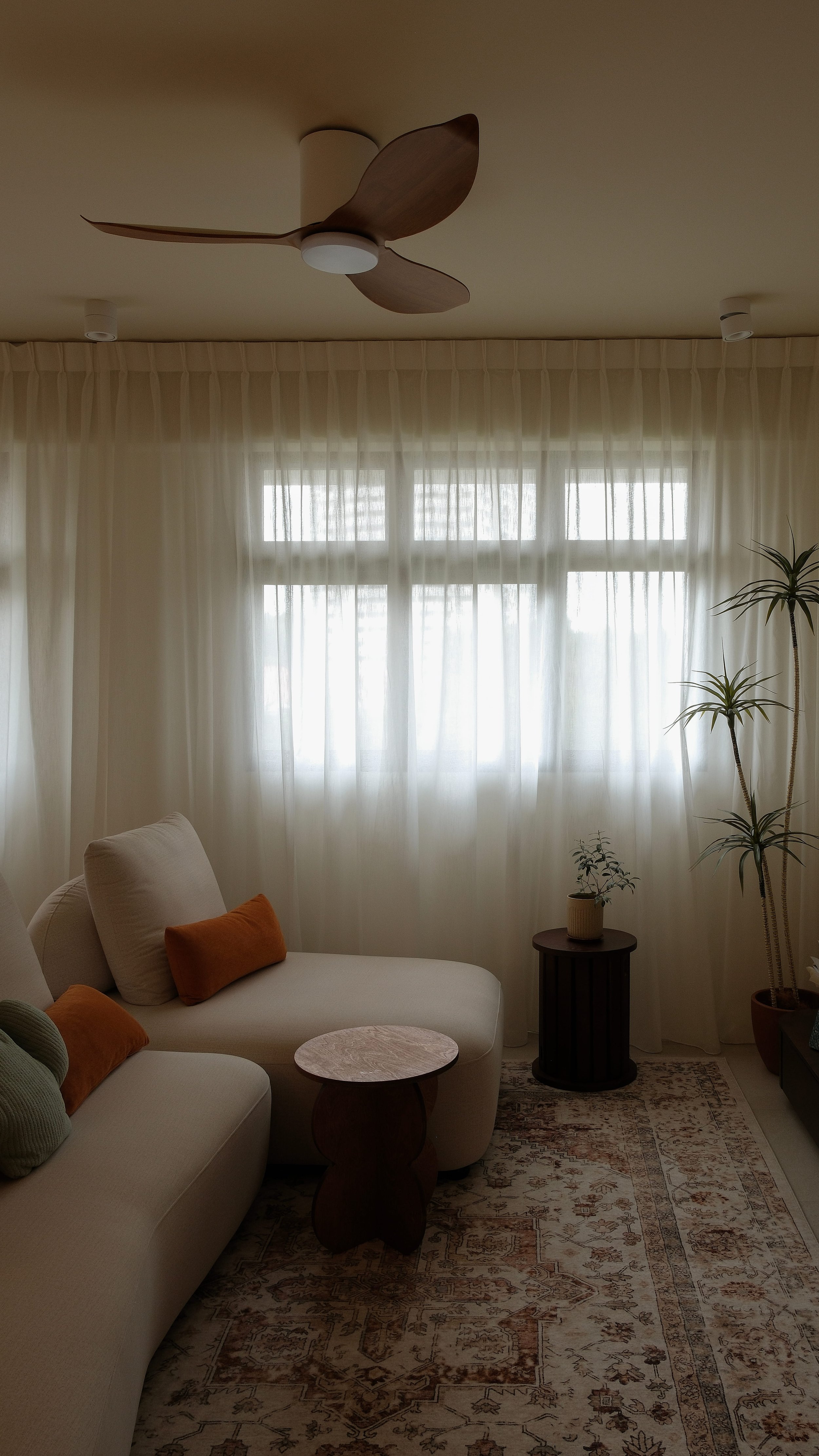The living room feels like a mini getaway, with large windows, potted plants, and hanging lanterns creating soft, layered lighting as the day winds down. Natural textures and thoughtful details bring the outdoors in, giving the space a tropical resort vibe.