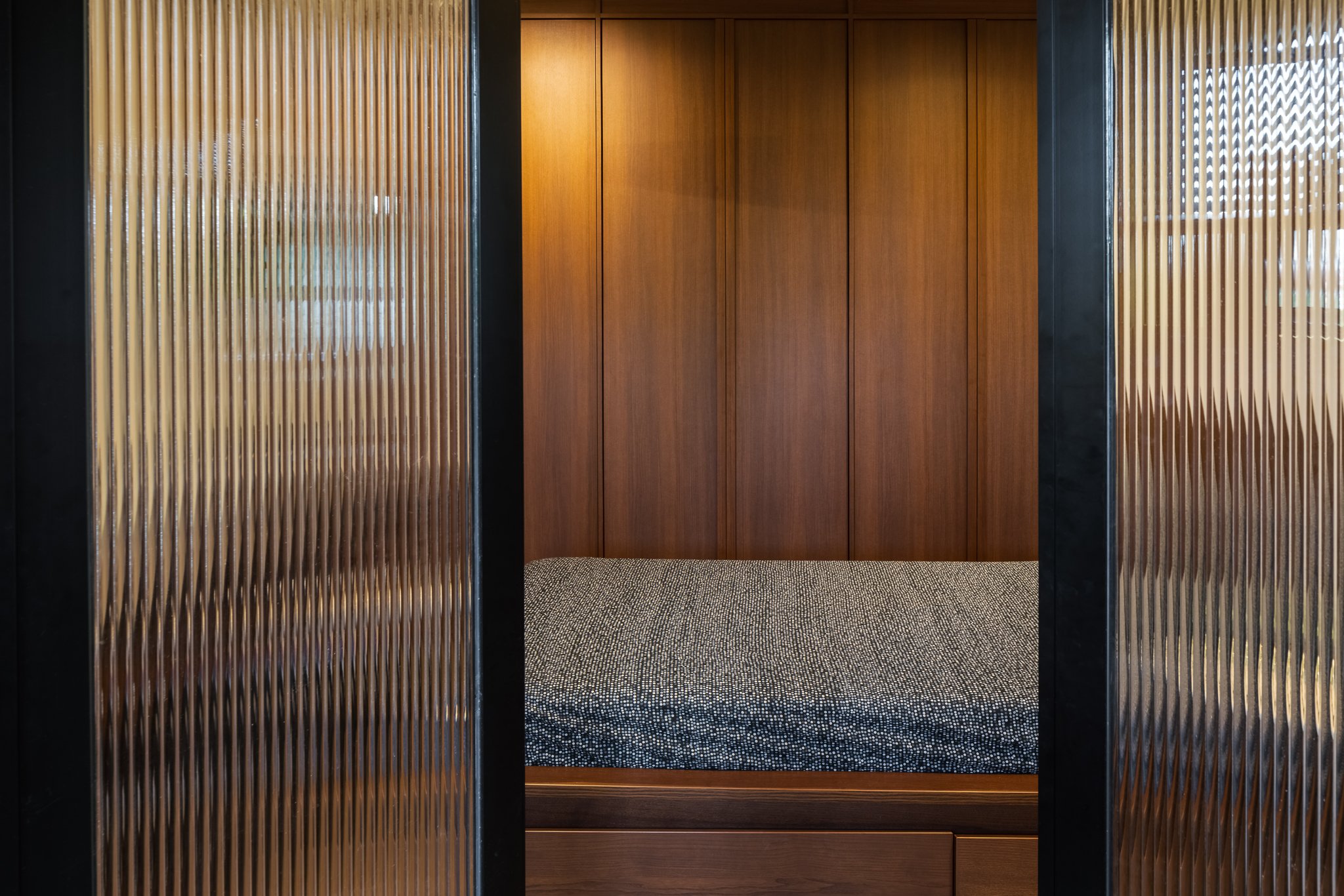 As you step into the apartment, you will be greeted by colourful art pieces that were specially curated to suit the theme and colonial style floor tiles that were tastefully matched with walnut tone timber floor tiles. Walking past the counter that overlooks the Southern greenery, you’ll find yourself heading down an arc hallway that leads to a bedroom that can be cordoned off with reeded glass folding doors.