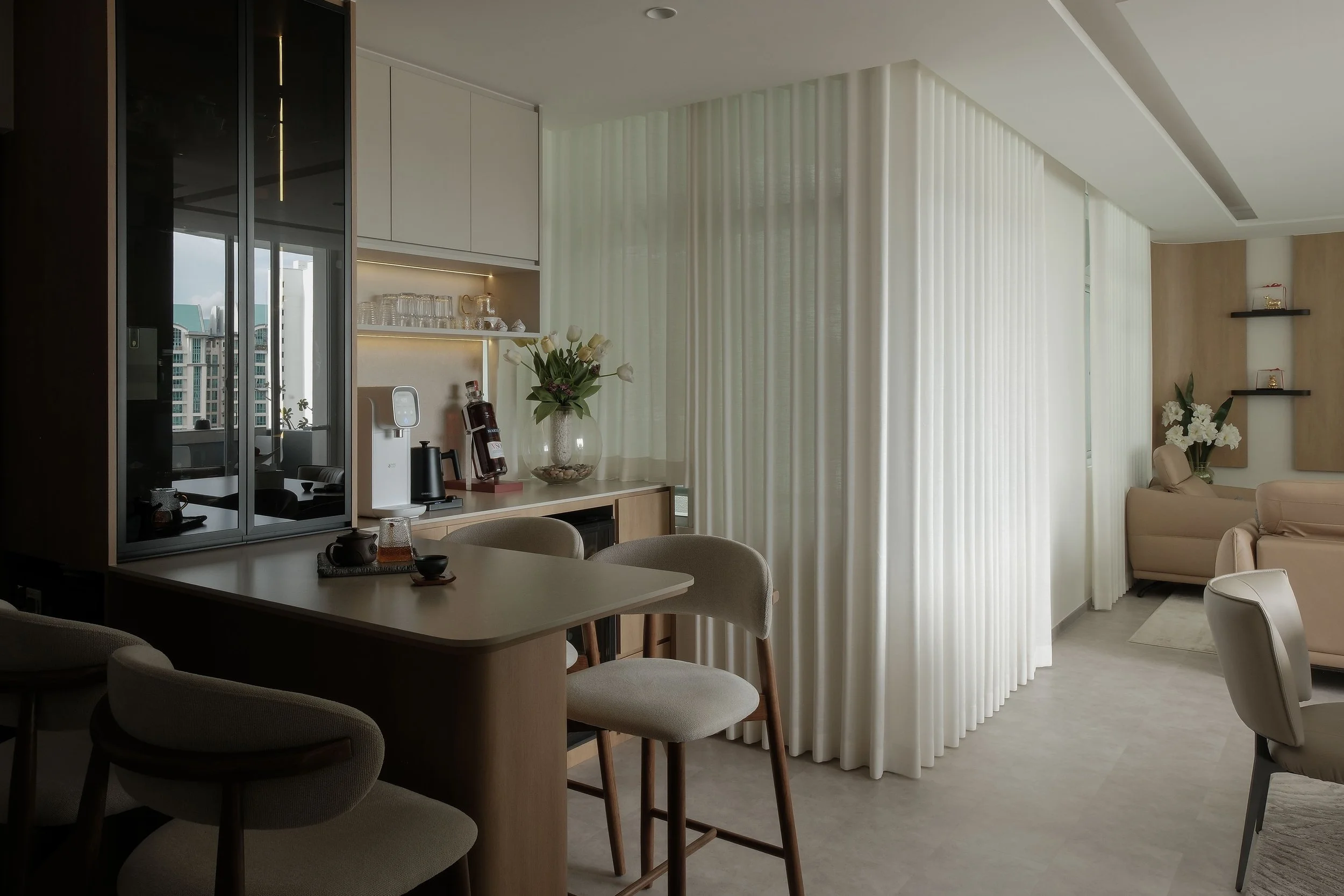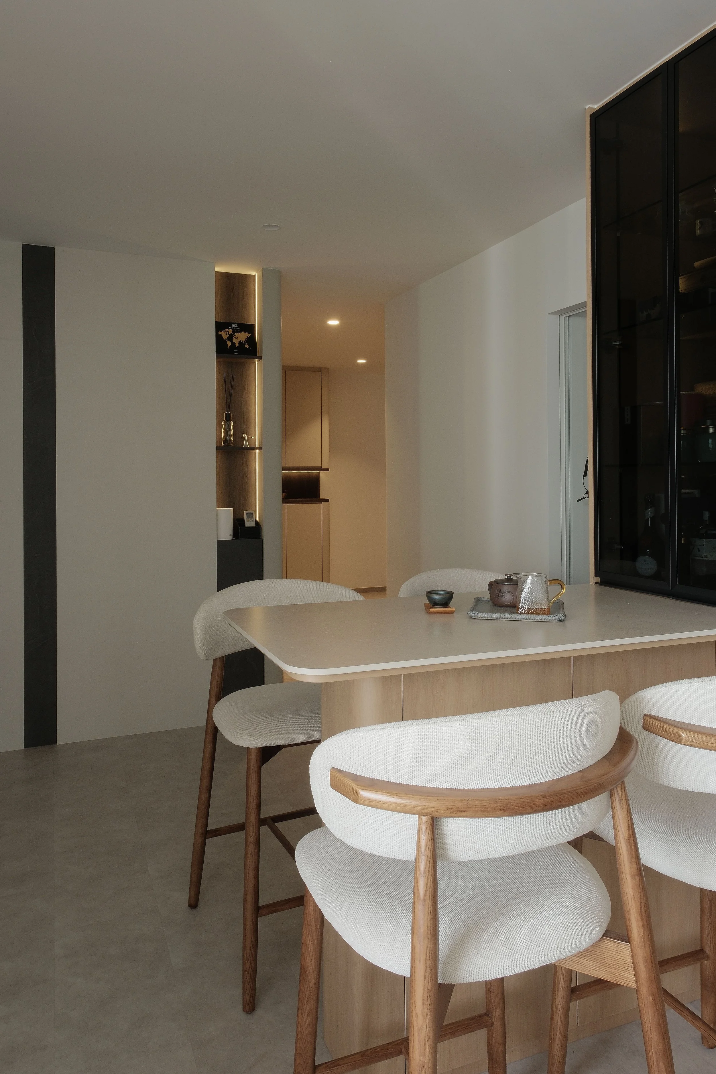 As tea and wine enthusiasts, the homeowners have a dedicated corner to display their teapots and wine collection. To the right, a dry pantry features an island with a built-in wine display and a small wine chiller, perfect for late night conversations and relaxed drinking sessions.