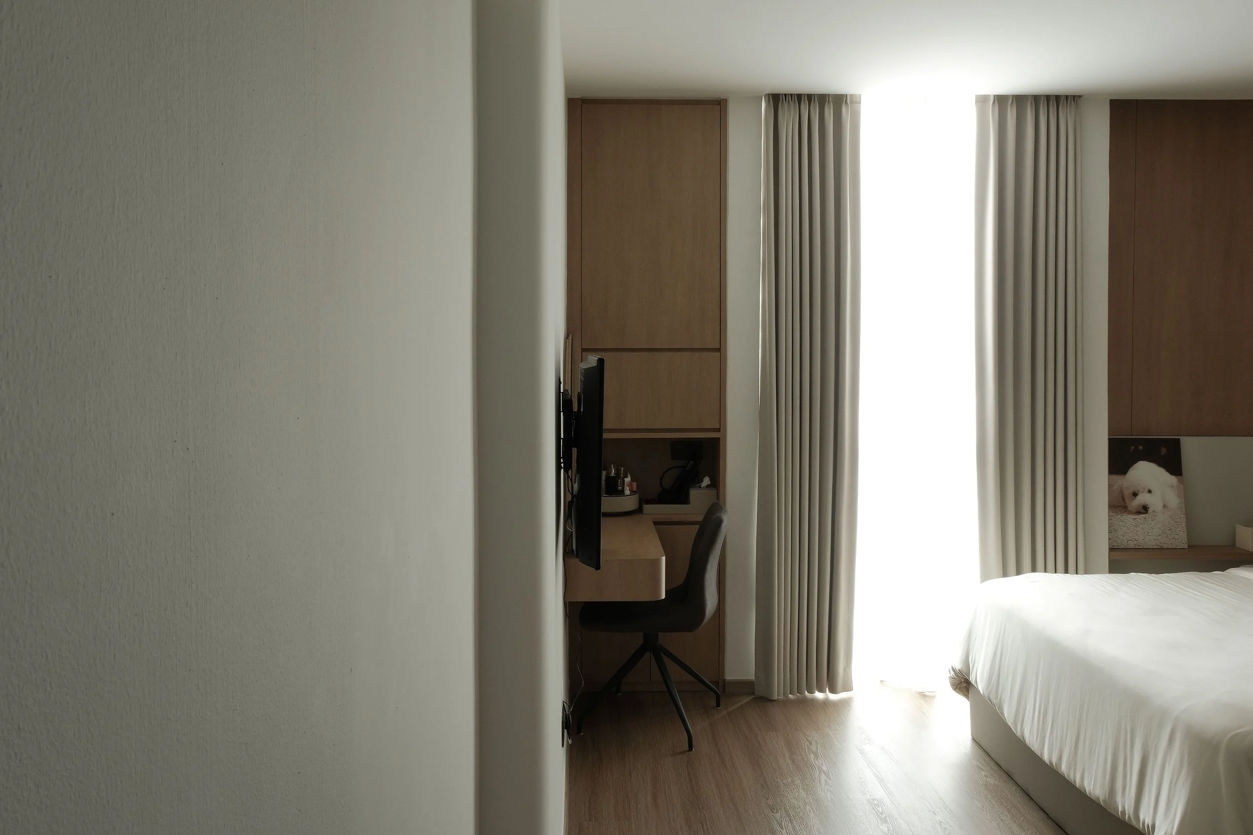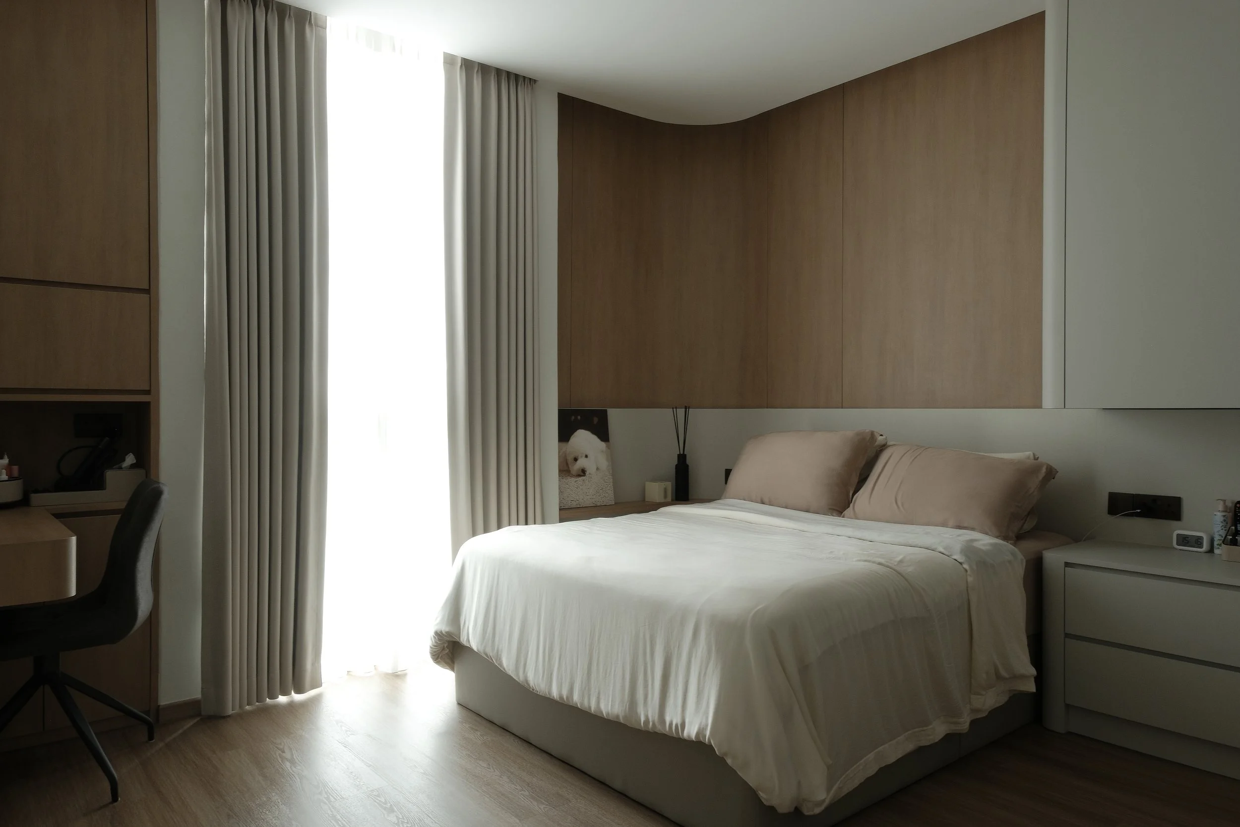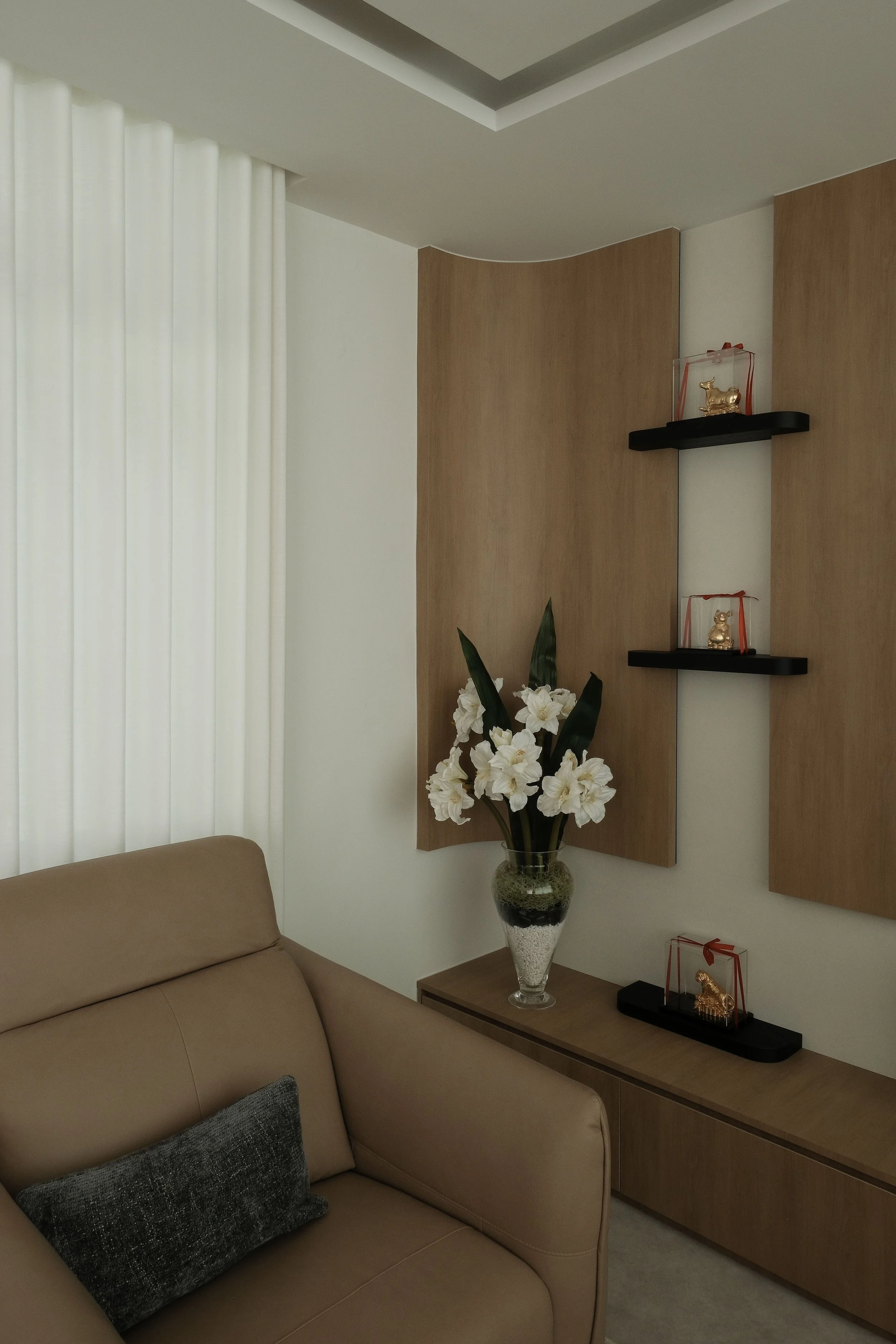 The living room is divided into three distinct zones. The television area is framed by sheer curtains on both sides, drawing attention to the laminated feature wall at its centre. A gentle curved detail on one side, paired with two short wall shelves, adds a touch of personality to the space. Cove lighting bathes the room in a warm, indirect glow, highlighting textures and saving ceiling space while making the living area feel both intimate and spacious.
